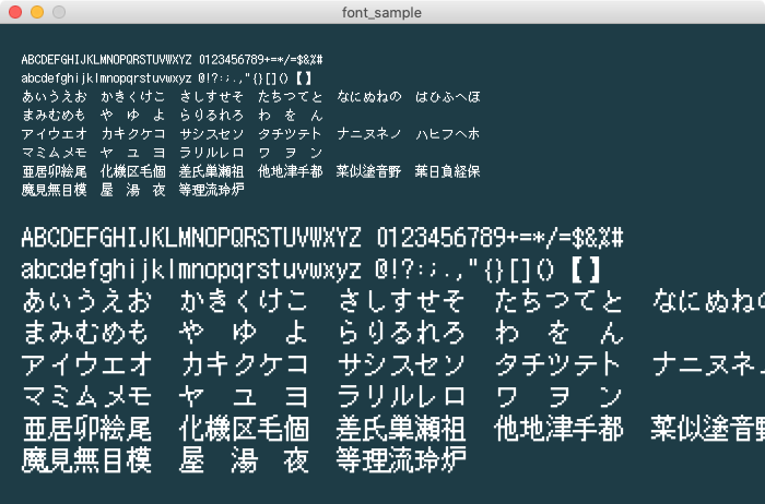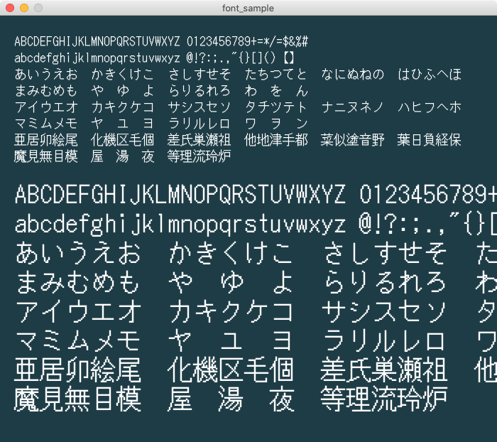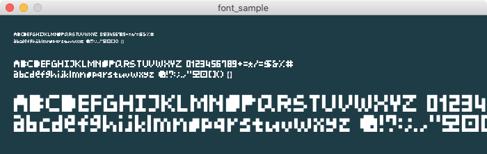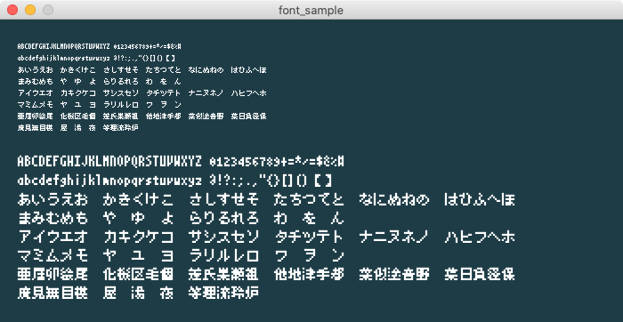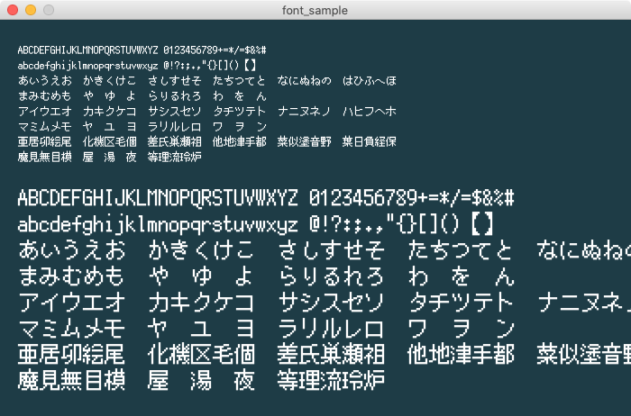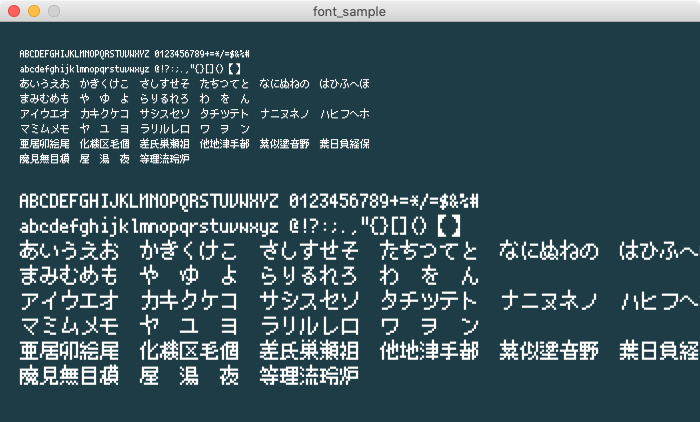 日本語対応の8pxフォント。潰れてしまう部分はありますが、最小の日本語対応フォントと思われます。倍の16ドットに引き伸ばすとドット感もでて良い感じ。
