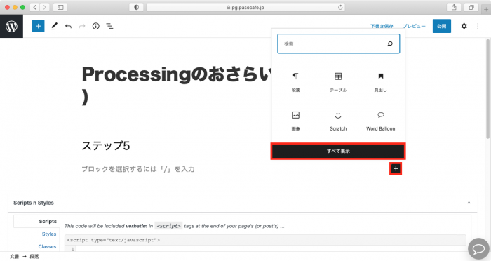投稿を新規作成し、タイトルや本文を入力する。プログラムコードを載せたいブロックの [+] ボタンをクリックし、更に [すべて表示] ボタンをクリックする。