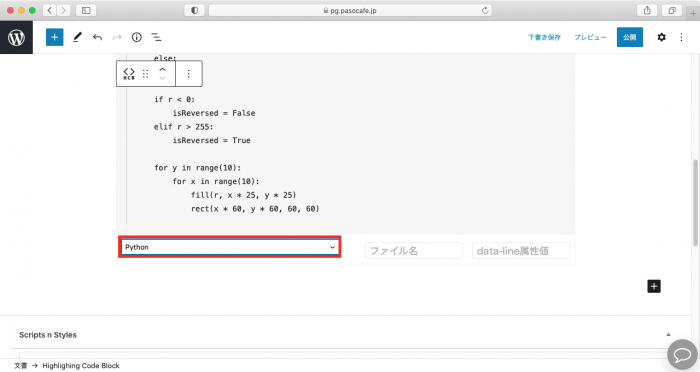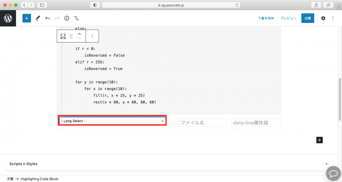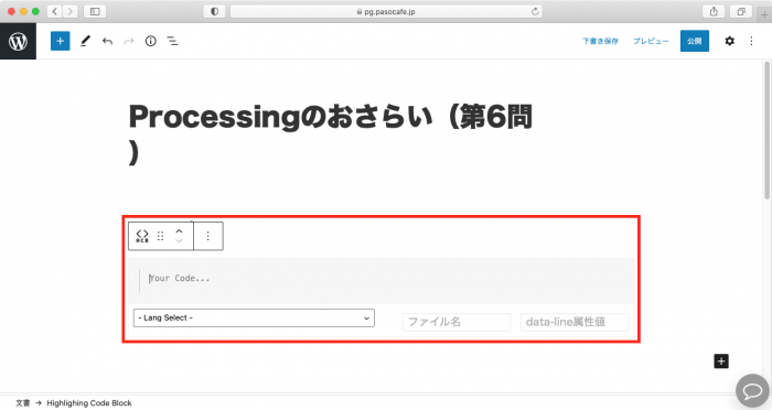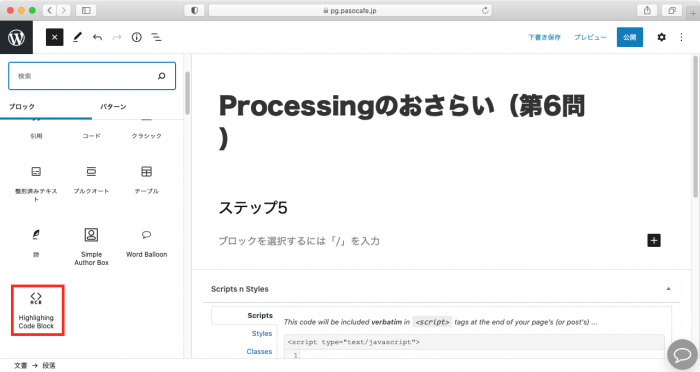 左側のブロック一覧から(スクロールする必要があるかも) [Highlighing Code Block] をクリックする。