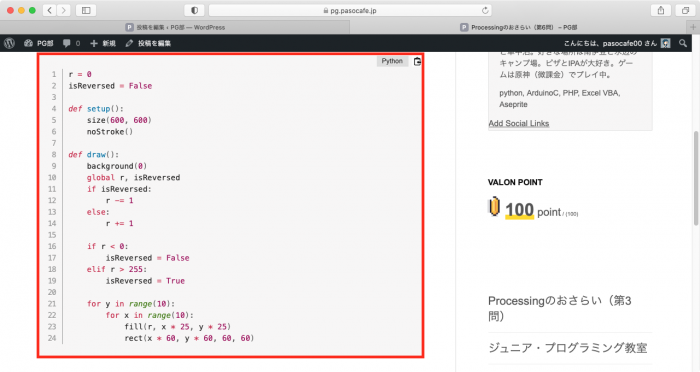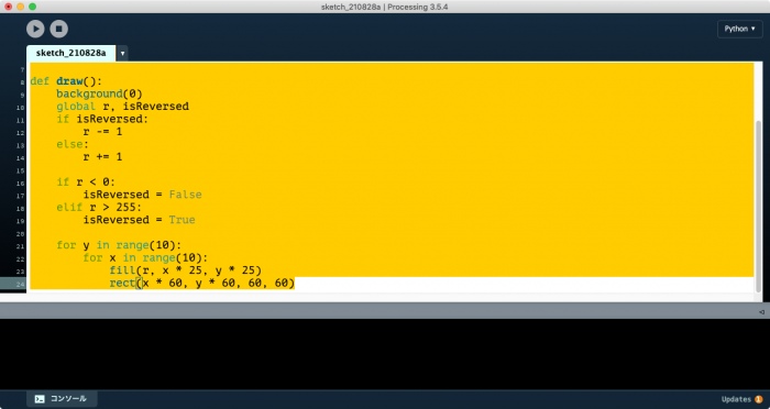 Processingに切り替えてソースをコピーする。コード欄をクリックして [Ctrl + A] で全選択をし、 [Ctrl + C] でコピーする。