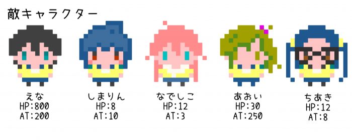 - 戦闘シーンの強化。キャラクターが5種ランダムで出てくるようになりました。(敵キャラによっては、攻撃力が高いキャラ、HPが高い高いキャラもいるので、倒せないかも!?