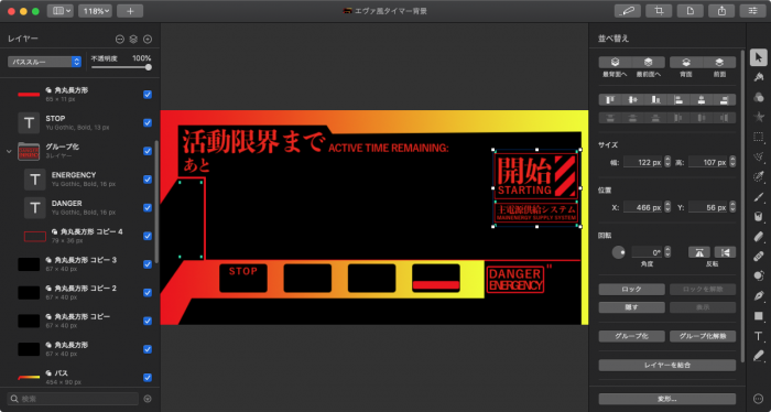 参考画像をもとに真似して作ってみた。開始アラートの斜線部分を作るのが大変だった!簡素に作るはずだったけど…作り始めるとついついアレモコレモ🤪