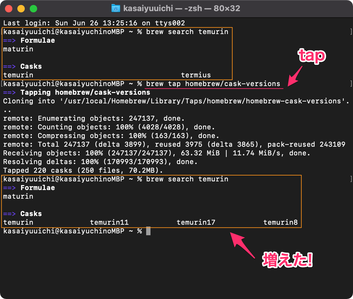 brew untap ユーザー/リポジトリ名 # リポジトリの削除tapは分かりづらいですが、パッケージの旧バージョンも扱えるようにするコマンドです。下記はJDKの旧バージョンも扱えるようにした例。