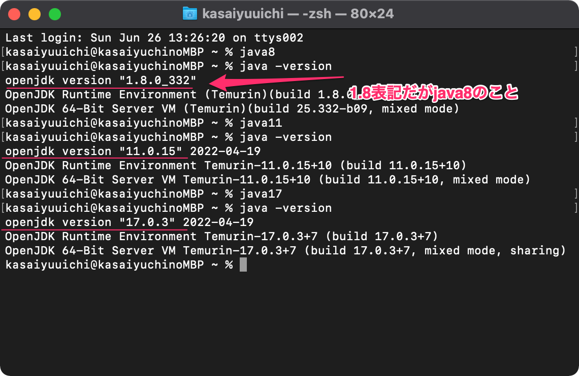 echo '# 各バージョンのJAVA_HOMEを設定' >> ~/.zshrc