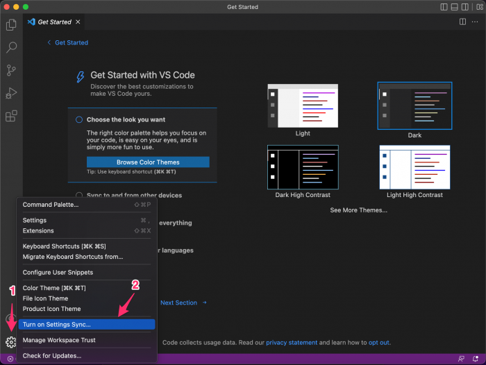 画面左下の歯車ボタンを押して、「Turn on Settings Sync…」を選択。←スクロールしないとでてこないかも
