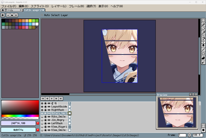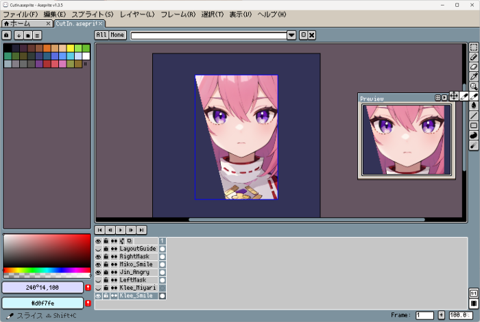 Asepriteにはマスクレイヤーの機能が無いため、手動でエクスポート作業をした。ちなみに次回大型アップデートのv1.4ではマスクレイヤーが実装されるらしい。