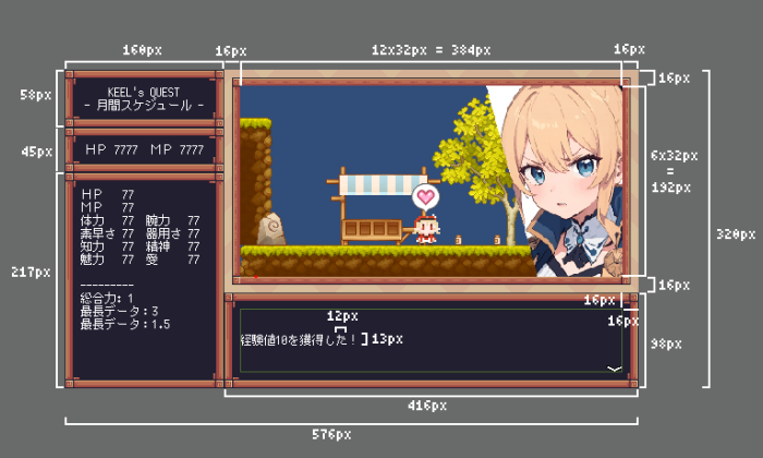 ワールド情報を追加し始めた。Player情報の一部ということでPlayerStatsの中に実装。PlayerステータスもHP、MP、LV、経験値、所持金をMainStatsとし、腕力、素早さなどはBaseStatsと分けることにした。HPは4桁になるし経験値や所持金はもっと大きな桁になる。またカンマ区切りの表記をしたい関係もあり分けて考える必要がある。BaseStatsについては最大2桁として、項目数も多いため、1行に2項目ずつ表示しないと長ったらしくなるので、これもまた分けて実装する必要がある。今後アビリティなどはExtraStatsやAbilityStatsなどと付けて実装するのかな??