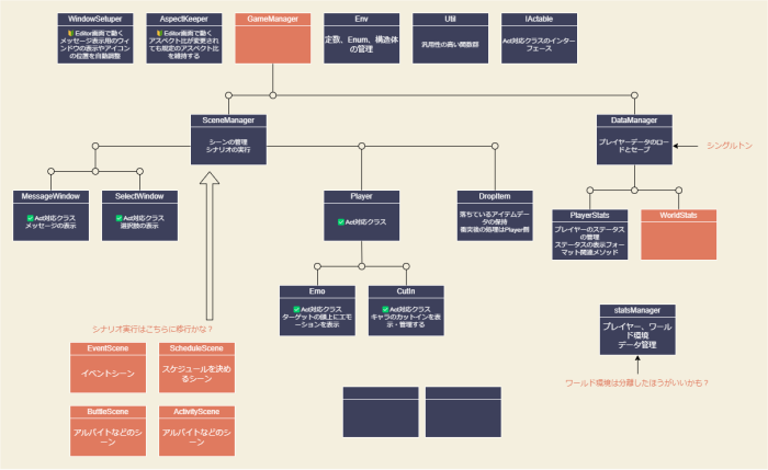 現在の作業は月曜日に考えたシチュエーションからスケジュールとアクティビティを作ろうと考え、下準備として、ゲーム内の年月日や曜日などのデータ管理や保存の扱いを整備することにした。それに伴い、既に作成してあったプレイヤーステータスに関してもリファクタリングをかけようと検討中。プレイヤーステータスだけ保存すればいいわけではなくなってきたので、データ管理(ゲーム内での保持管理・データロードセーブ)を行う構成を再検討する必要がある。