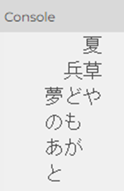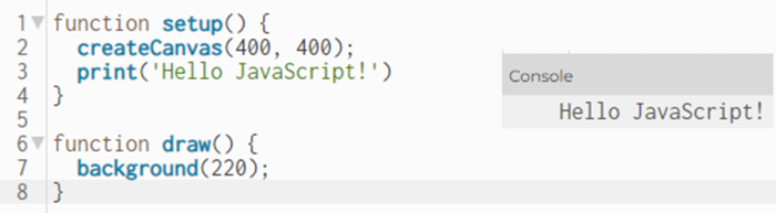 プログラミングの第一歩は「print文」です。文字列をコンソール(動作確認用画面)に表示する役割があります。計算結果や、処理の途中の状態を出力して確認することができます。p5.jsに限らず、print文から出発することで、プログラミングの基礎を着実に学ぶことができるようになります。