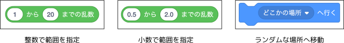 乱数は、乱数のブロックに数値を入力することにより範囲を指定することができます。範囲は整数だけでなく、小数でも指定することができます。また、ランダムな場所へ移動するためのブロックも用意されています