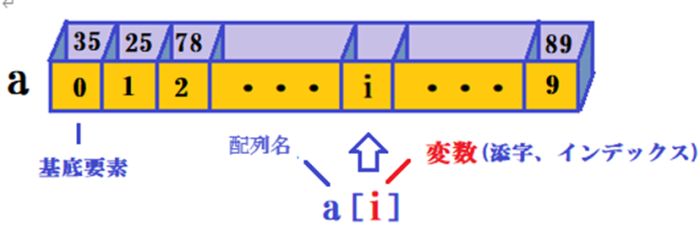 たとえば「35,25,78,43,80,65,70,95,25,89」という10個のデータがあったとき、このデータを配列に格納するには以下のようにする。0番目の要素はa[0]、1番目の要素はa[1]のように参照できる。