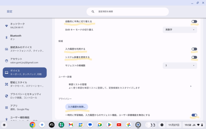 「入力方法」グループの「日本語」項目の「▶」ボタンを押下