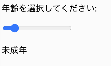 年齢をスライダーで選択し、年齢に応じてメッセージを表示するプログラムを作成しなさい。たとえば、年齢が10歳未満なら「子ども」、10歳から18歳未満なら「未成年」、18歳以上なら「大人」と表示します。