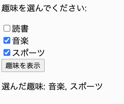 チェックボックスを使用して、いくつかの趣味を選び、それをまとめて表示するプログラムを作成しなさい。趣味の選択肢は「読書」「音楽」「スポーツ」にします。