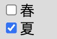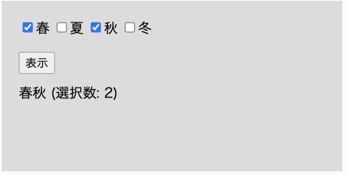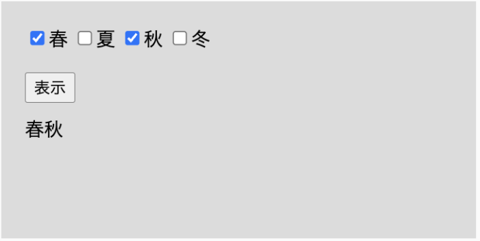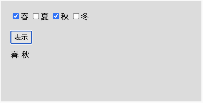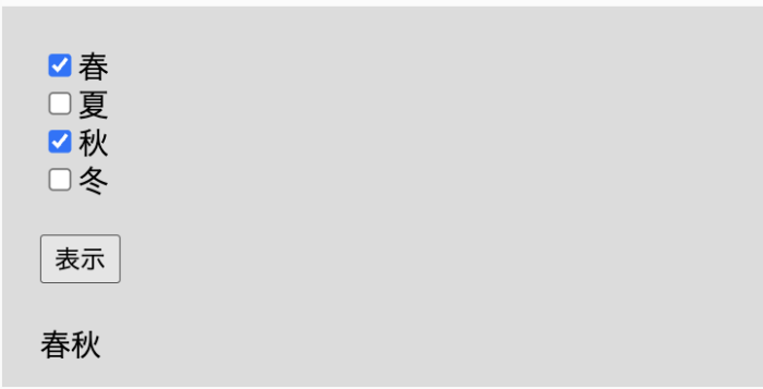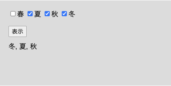 春、夏、秋、冬のチェックボックスから選択されている内容を表示する。チェックの判定をコンパクトにするためにcheckboxを配列とする。