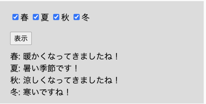 各季節の選択によって異なるメッセージが表示されるようにします。たとえば、「春」が選択されていれば「暖かくなってきましたね!」などと表示するようにします。複数の季節が選択されている場合は、それぞれのメッセージをまとめて表示します。
