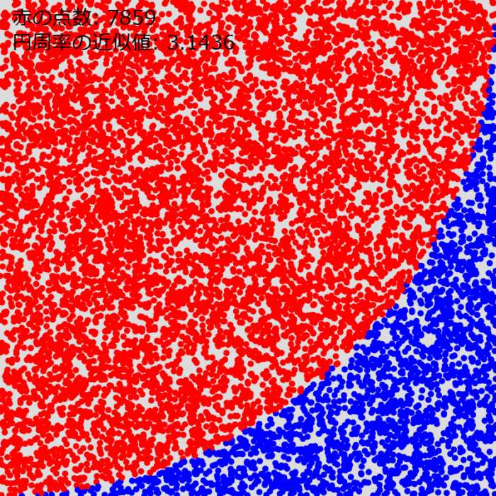 横400縦400のウィンドウを開き、0から399までの乱数を2つ生成してx,y座標とし、原点からの距離が400以下であれば赤、400よりも大きければ青の円をその位置に描く。この手順を繰り返し、正方形中のランダムな位置に円を10000個描きながら赤の点の個数を数え、点の個数から円周率の近似値を求めるプログラムを作成せよ。