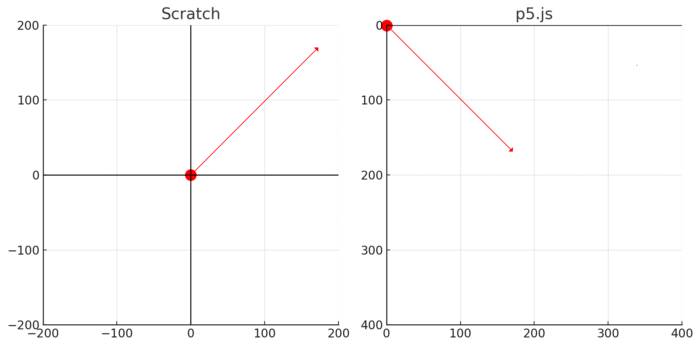 Scratchと違い、左上が(0, 0)です。右に行くほど x が増え、下に行くほど y が増えます。
