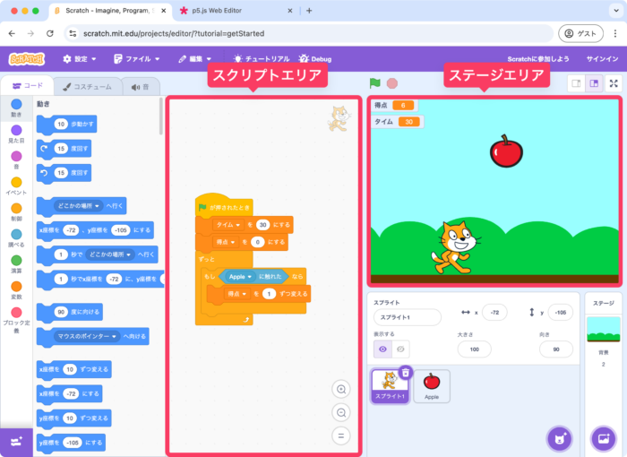 Scratchではスクリプトエリアに作成したプログラムが動作すると、ステージエリアに結果が表示されました。