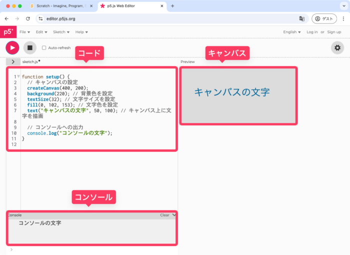 一方、p5.jsではスクリプトエリア(コード)に作成したプログラムの結果を、キャンバスやコンソールなどに出力することができます。