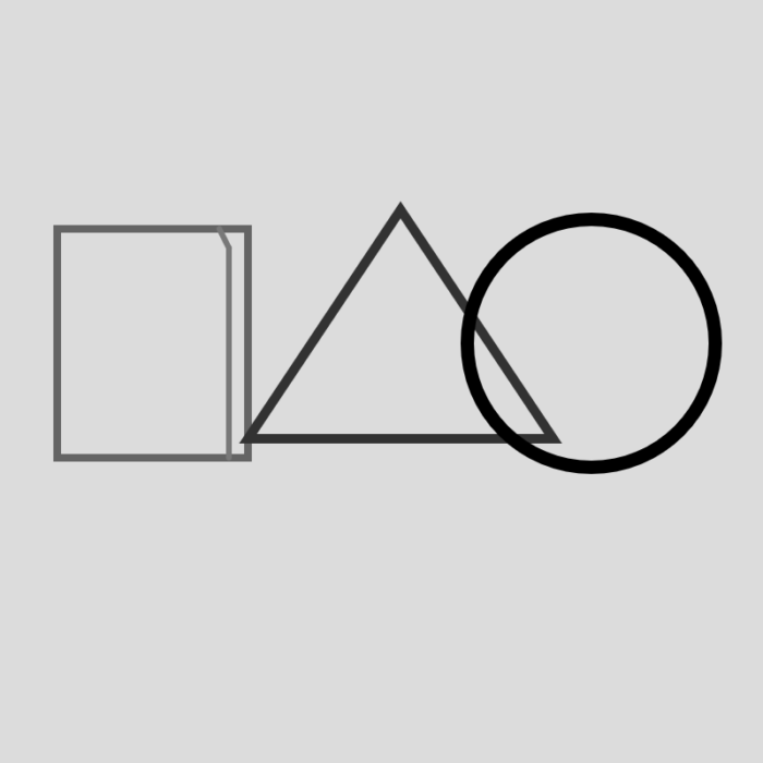 1.四角形、三角形、円の線の太さ(strokeWeight)、色(stroke)をそれぞれ微調整をした。