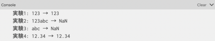 ・数字と文字の文字列や文字だけの文字列は数値に変換されず、NaN(Not a Number)となった。
