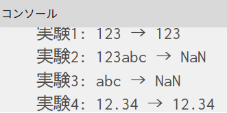 Nunber()関数は数字だけの時や数字+小数点の場合は正しく変換されるが、文字が1個でも含まれている場合は数値に変換することができなくなりNaN(Not a Nunber)と出るようになる。