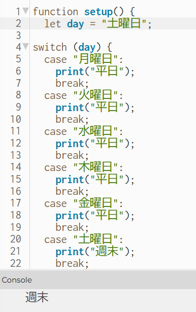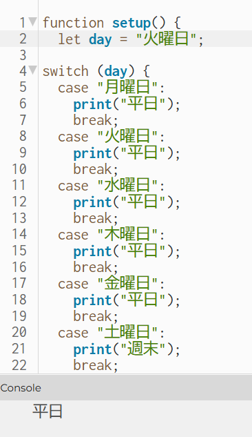 ・switch文を書くとき、最初にだけ switch (day) { を入れるけど、2個目以降の”case”のところには、switch (day) { を入れてしまってミスをしてしまったので、次からは気を付けたい。