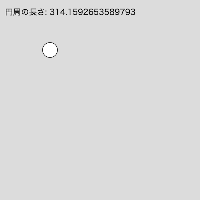 お手本のプログラムを完成させる。半径を定数で定義して、その値を使って、画面の中心に円を描き、円周の長さを計算して表示するプログラムをつくる。