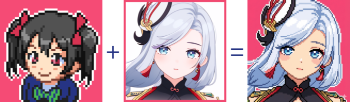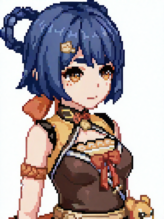 MiaoMiao Pixel + 原神キャラLoRAで出力。ドット絵に見えるけど拡大すると、ピクセルがぼやけてた、なんちゃってドット絵。
