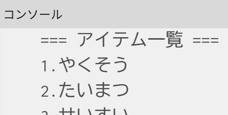 print("=== アイテム一覧 ===");